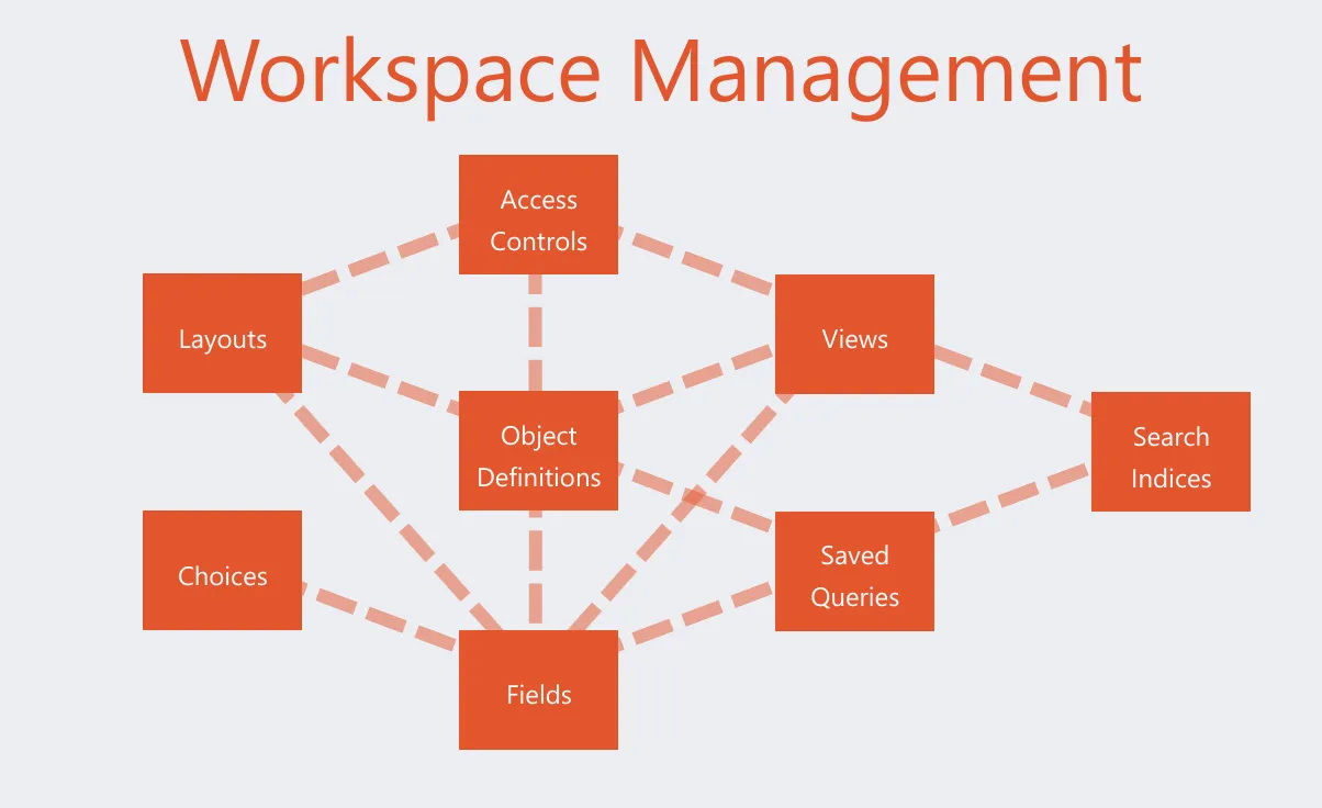Section titled “Core Components”- Object Definitions are the focal point in Workspaces. They assemble all other object based data models by using Fields of different types. Some Field types make use of Choices.