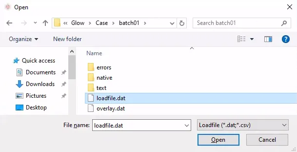 In the Open dialog select the file loadfile.dat from your previously processed batch01 folder and click the button Open.