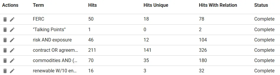 - The Saved Query is executed and results displayed. Note that the list is filtered to Documents with actual hits and the responsive terms can be seen on the right column.