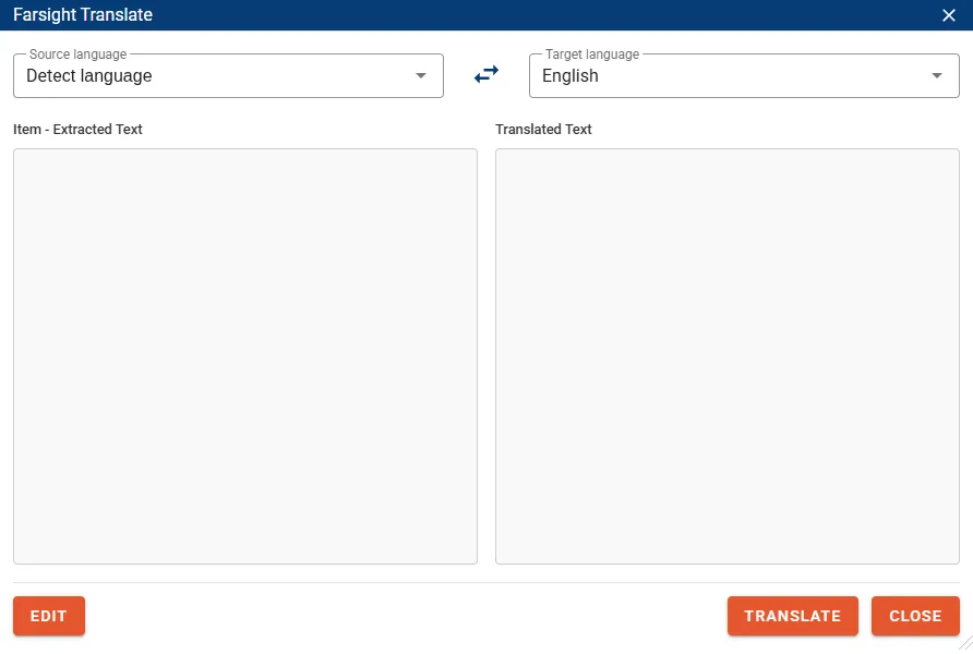 - If needed perform manual adjustments to the Source language and Target language then press the button TRANSLATE to start the process.