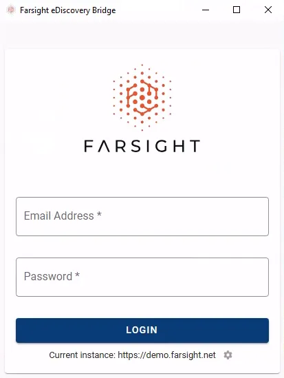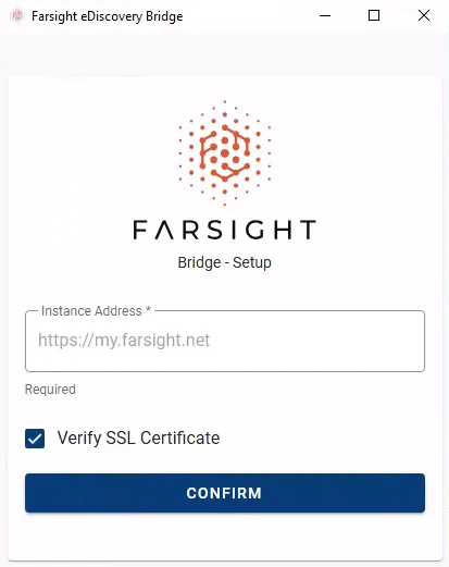 Section titled “Startup & Login”- Starting Farsight eDiscovery Bridge for the first time will require to enter the Instance Address of the Farsight instance you want to connect to.
