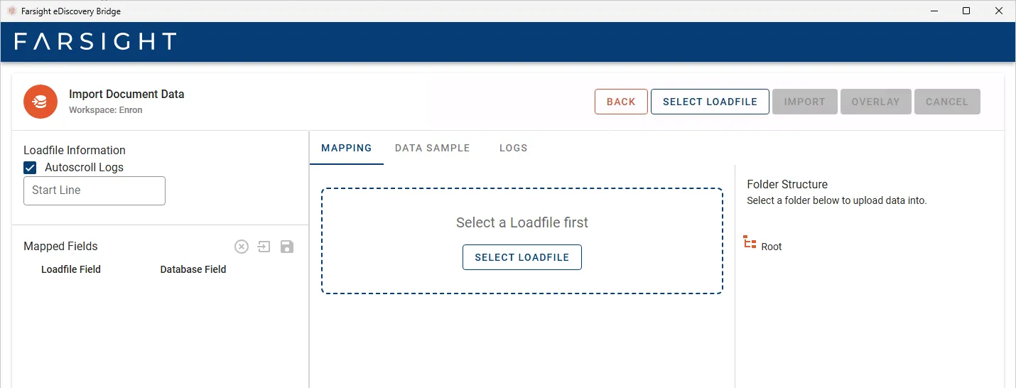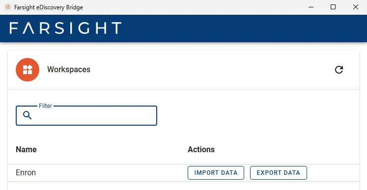 The eDiscovery Bridge is a desktop application and primarily used to import processed data into Farsight Workspaces. Additionally existing Workspace records can be updated (overlay) or downloaded to files (export).