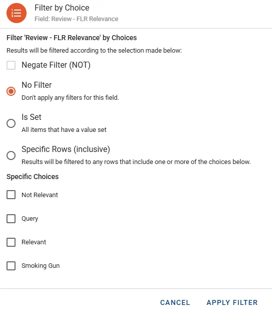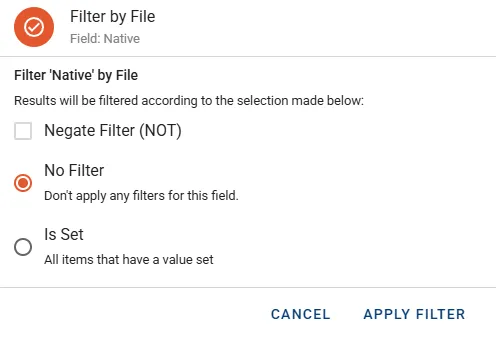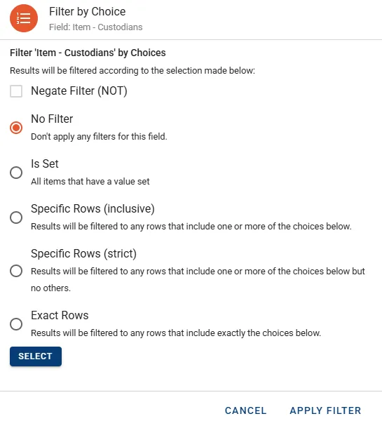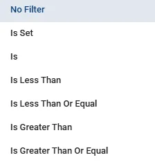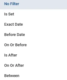 Section titled “Column Filters”The given Field type determines the applicable column filter and are rendered accordingly:
