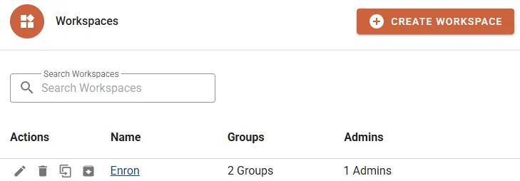 Section titled “Actions”- Edit allows renaming the Workspace and modifying associated administrators or Groups.