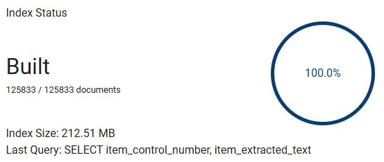 Status section shows details about build state, Document count, index size and linked query.