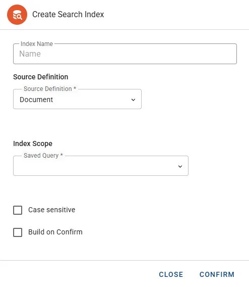 Section titled “Create Search Index”- On the Search Indexes tab, click the button NEW SEARCH INDEX in the top right corner. Please note that the button is grayed out unless a Saved Query was created.