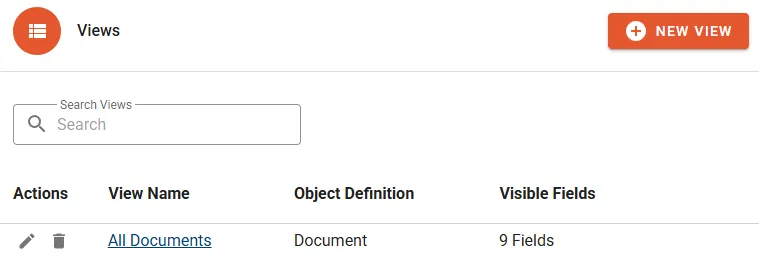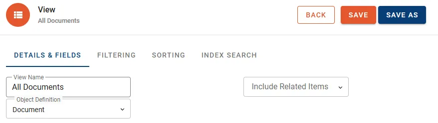 Section titled “DETAILS & FIELDS”- On the tab Views click the button NEW VIEW in the top right corner. This will present the screen shown below.